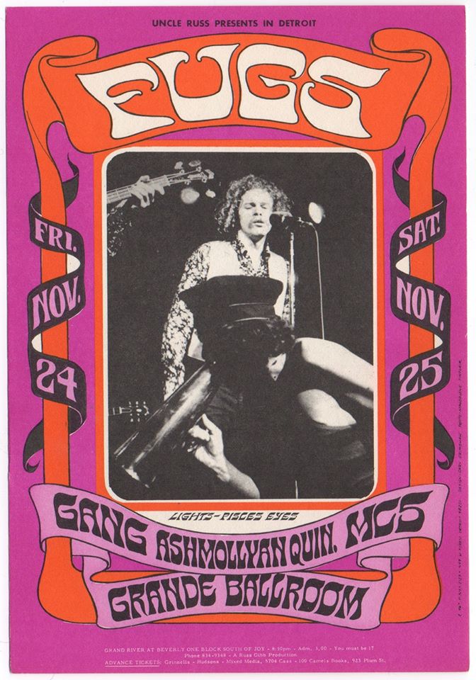 The 60th weekend at The Grande Ballroom, November 24-25, 1967 featured Gary Grimshaw’s 30th poster for the venue. The Fugs headlined both nights with support by MC5, the Gang, and the Ashmollyan Quintet. The Gateway lists both nights for the MC5, but the ad shows them opening the second night only, November 25, 1967.