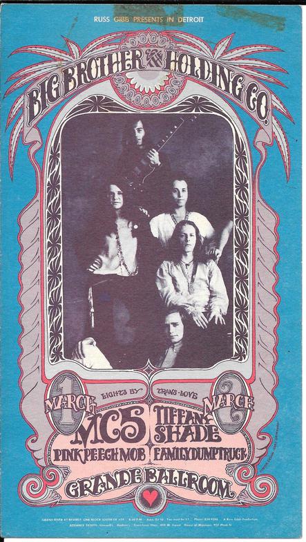 The 74th weekend at The Grande Ballroom, March 1-2, 1968, featured Gary Grimshaw’s 38th poster for the venue. Big Brother & the Holding Co.headlinedd both nights with support by the MC5, and Pink Peech Mob on the first night, March 1, 1968, and Family Dump Truck, and Tiffany Shade on the second night
