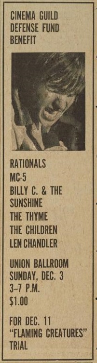 An ad for a benefit concert at the Union Ballroom in Ann Arbor, Michigan, December 3, 1967 with the Rationals, MC5, Billy C. & the Sunshine, The Thyme, The Children, and Len Chandler, to raise funds for the defendants in the upcoming “Flaming Creatures” obscenity trial.
