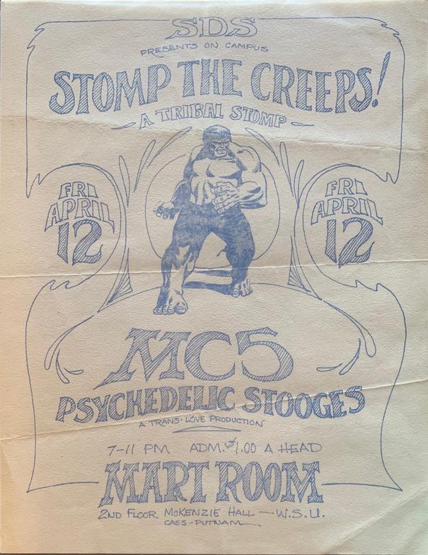 Poster/flyer by Gary Grimshaw, for the MC5 and the Psychedelic Stooges at Wayne State University in Detroit, Michigan, April 12, 1968.