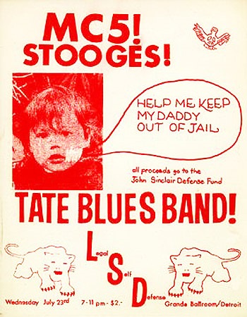 At one point in the conversation, someone allegedly pointed out that Sinclair could possibly be in jail in the near future, but nobody really believed that. The benefit shows continued to raise money, such as this show at the Grande Ballroom, July 23, 1969, (ten days after a similar event at the Eastown) with MC5, Stooges, and Tate Blues Band, victories were being achieved by his legal team over the two-and-a-half-year long battle, and nobody thought that Sinclair would ever go to jail. Poster by an unknown artist.