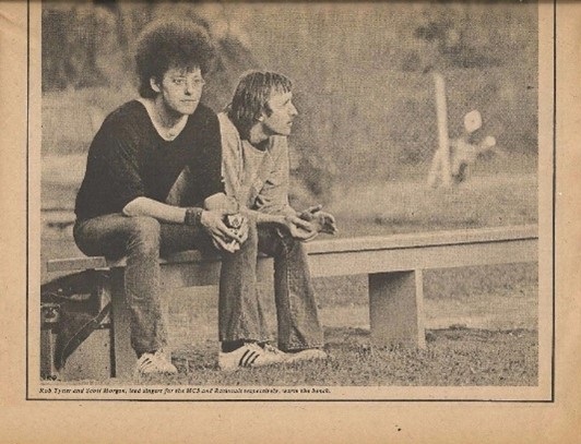 Inside photo from Issue #5, June 1970, of Big Fat magazine with a photo of Rob Tyner and Scott Morgan during a musician’s baseball game. The Fifth Estate newspaper in Detroit reported that the MC5 beat the SRC by the score of 14-7.