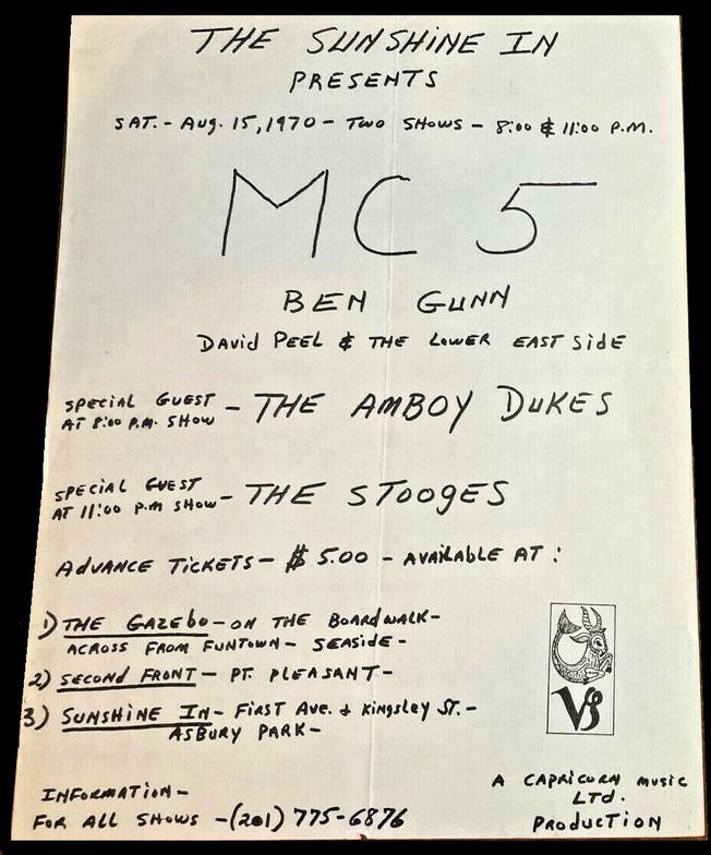 Little artistic value, but packed with information, this flyer has the details of the two shows by the MC5 at the Sunshine In, Asbury Park, New Jersey, clarifying the details of two shows on August 15, 1970.