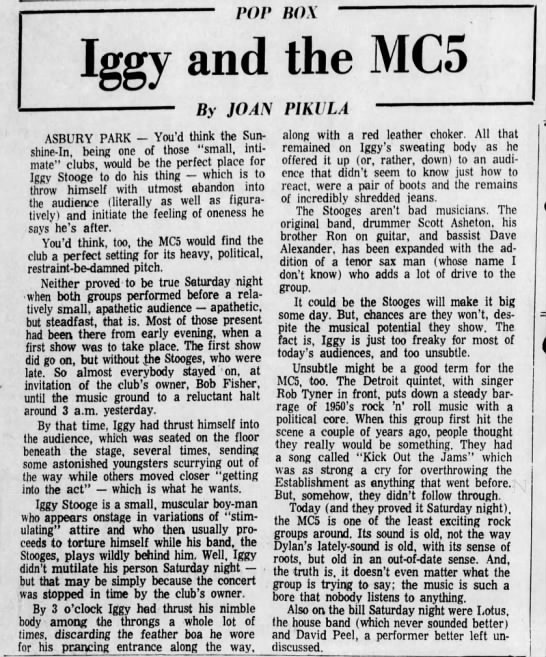 Show review of Iggy and the MC5 from their appearance at the Sunshine In, Asbury Park, New Jersey on August 15, 1970 in the August 17th issue of the Asbury Park Press newspaper.