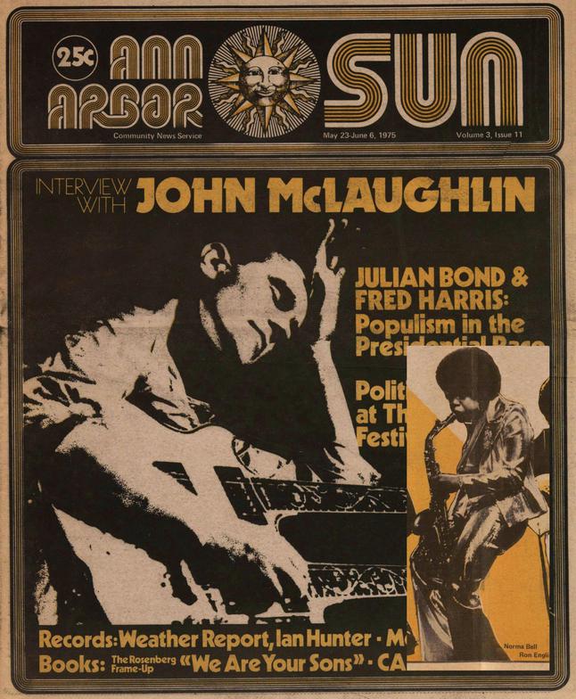 The cover of the May 23, 1975 edition of the Ann Arbor SUN newspaper in Ann Arbor, Michigan with an interview with John McLaughlin who had recently performed at the Masonic Auditorium in Detroit, opening for Jeff Beck. The insert is Norma Jean Bell who had been performing with Lyman Woodard until she joined McLaughlin’s band.