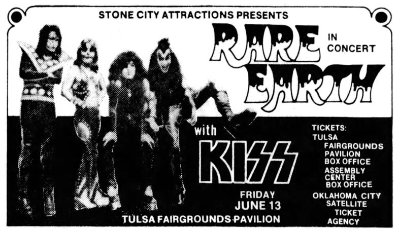 An ad with KISS opening for Rare Earth in Tusla, Oklahoma on June 13, 1975.