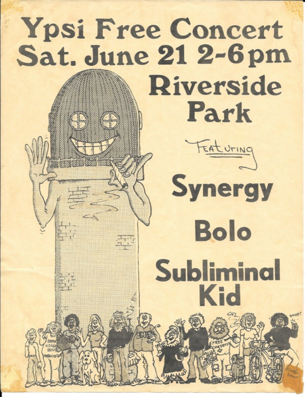 Ann Arbor, Michigan had its summer Sunday free concerts, neighboring Ypsilanti had summer Saturday free concerts, such as this one on June 21, 1975, featuring Synergy, Bolo and Subliminal Kid, artwork possibly by Gary Kell.