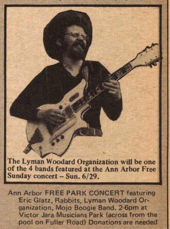 An ad for the Sunday Free Concert in Ann Arbor, Michigan on June 29, 1975, featuring the Lyman Woodard Organization, Eric Glatz, Rabbits, and Mojo Boogie Band.