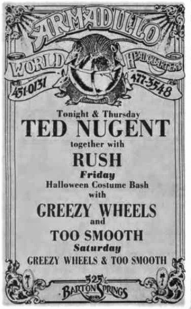 Poster/ad for Ted Nugent & the Amboy Dukes at the Armadillo World Headquarters in Austin, Texas on October 29-30, 1975.