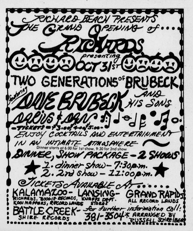 An ad by an unknown artist jam-packed with text for a Halloween show on October 31, 1975 at the Grand Opening of Richards with two generations of Brubeck, Dave and his sons Darius and Dan, but with all that text, one crucial piece of information is missing – where the hell is Richards located?