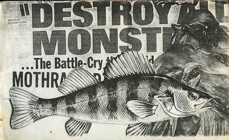 A more complete image of one of Jim Shaw’s 1975 posters for Destroy All Monsters.