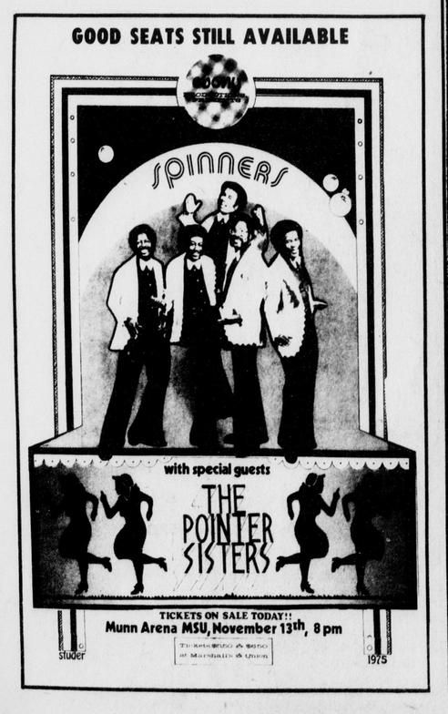 Two more ads for the Spinners and the Pointer Sisters at Michigan State University in East Lansing on November 13, 1975.