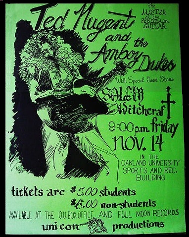 A poster by an unknown artist, and newspaper ad, for a previously undocumented show by Ted Nugent & the Amboy Dukes, with Salem Witchcraft, at Oakland University in Rochester, Michigan on November 14, 1975.