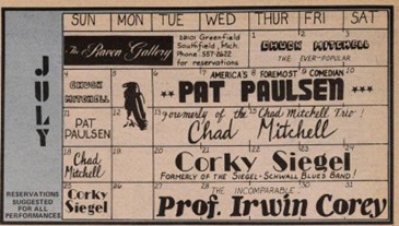 The July 1965 calendar for the Raven Gallery in Detroit, Michigan. Chuck Mitchell opened the month, this was about two months after he first met Joni.