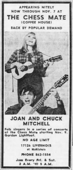 An ad for Chuck and Joni Mitchell, back at the Chess Mate in Detroit, November 2-7, 1965.