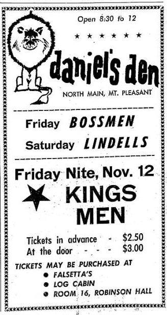 An ad for the Bossmen, Lindells, and Kingsmen at Daniel’s Den in Mount Pleasant, Michigan, November 12, 1965.
