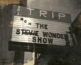 The marquee for The Trip in Hollywood, California, a favored venue for Motown acts, with the Temptations for eleven nights, February 17-27, 1966. Other Motown acts that "made the trip" in the Spring of 1966 were the Miracles, Stevie Wonder, the Four Tops, and Martha & the Vandellas.