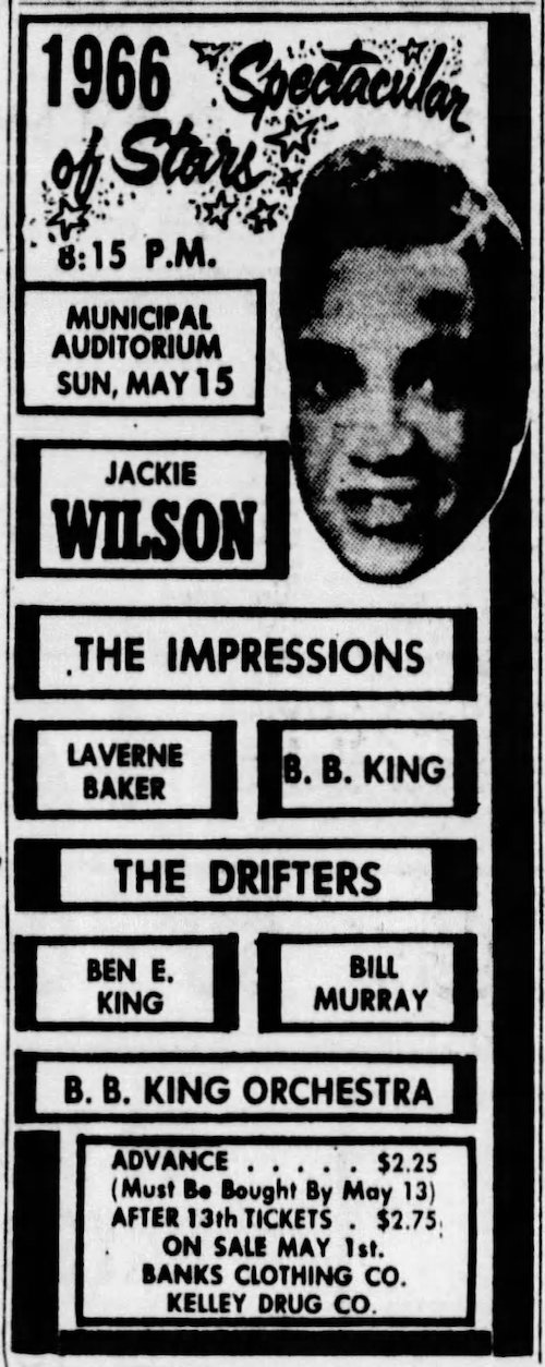 An ad for Jackie Wilson in Nashville, Tennessee on May 15, 1966.