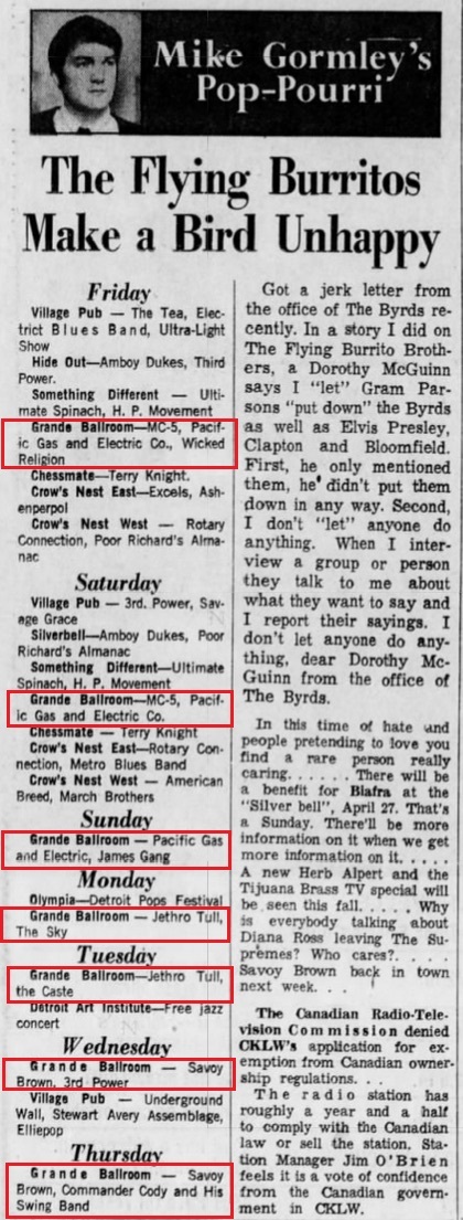 An entertainment column in a Detroit newspaper with a show at the Grande Ballroom every night of the week, April 4 – 10, 1969.