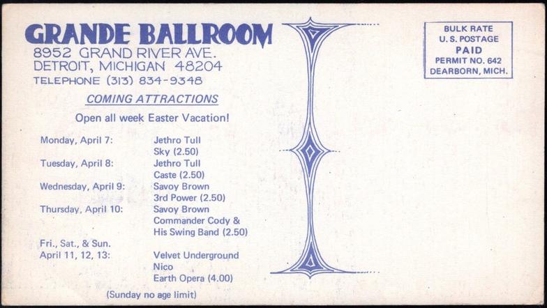 A poster for a string of mid-week shows at the Grande Ballroom, April 7-10, 1969 became Gary Grimshaw’s 59th poster for the venue. Jethro Tull headlined the Monday and Tuesday night shows, with support by Sky both nights and by Caste on the second night. Savoy Brown headlined on Wednesday and Thursday nights, with support by Commander Cody & His Swing Band and Third Power on both nights.