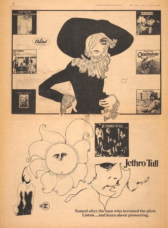 A page of art by Margo in Issue #2 of CREEM magazine, illustrating record company ads for Capitol Records and Reprise Records, and an ad layout with art by Linz with the staff box in the second issue of CREEM magazine.