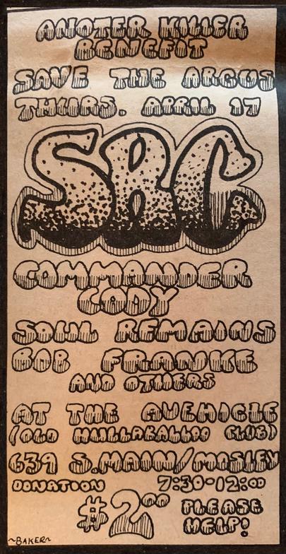 An ad by Dave Baker for the Argus benefit, April 17, 1969, before the addition of the MC5 to the bill.