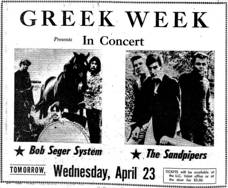 An ad for “Greek Week” at Central Michigan University in Mount Pleasant, featuring the Bob Seger System with the Sandpipers on April 23, 1969.
