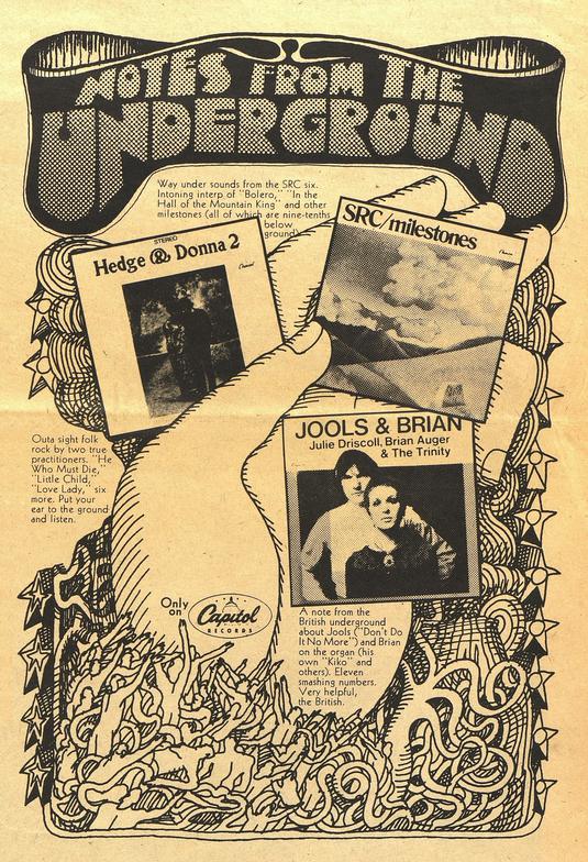 A Capitol Records ad in the May 16, 1969 issue of the Chicago Kaleidoscope newspaper with the second album by SRC, “Milestones”.