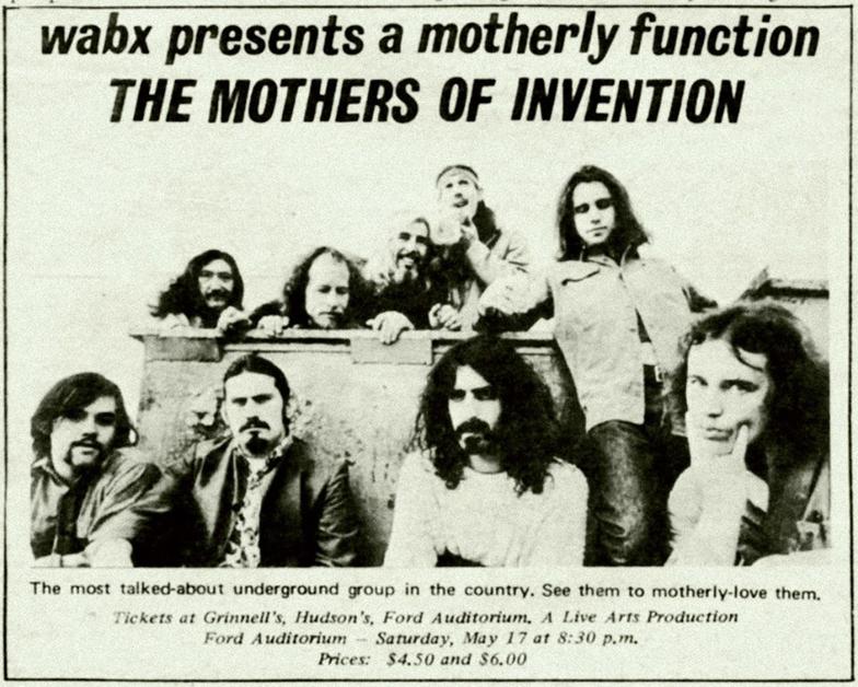 Frank Zappa brought the Mothers of Invention back to Michigan for the fifth time for this May 17, 1969 show at Ford Auditorium in Detroit. With a group this photogenic, even a newspaper ad could look cool.