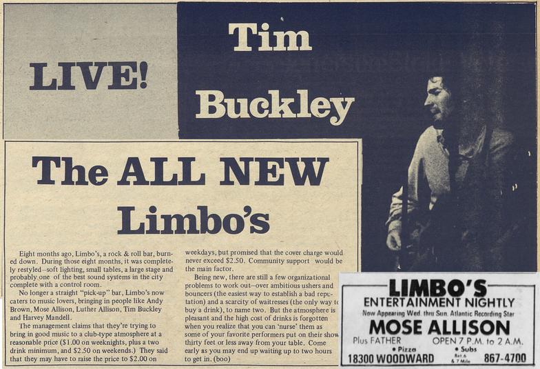 When Mose Allison took up a five night residency at Limbo’s Pizza Emporium in Detroit, Michigan, March 28, 1973 through April 1st. The location on Woodward and Six Mile was re-inventing itself, after a fire restoration, from being basically a restaurant with a pick-up bar into a first-rate music venue. Prior to the Mose Allsion gig, Tim Buckley had performed there at least two nights, March 17th and 18th, and possibly some nights prior, as The Fifth Estate newspaper reported on the Buckley show, “Limbo’s was packed. Many of the people in the audience had seen him earlier in the week and were back to see him again”.