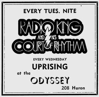 An ad for the weekly Tuesday show by Radio King & His Court of Rhythm at the Odyssey in Ann Arbor, Michigan, beginning April 3, 1973.
