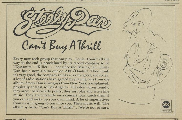 An ABC Records ad for the debut album by Steely Dan, coinciding with the group’s first Michigan appearance, opening for Beck, Bogert & Appice at Cobo Arena in Detroit, April 8, 1973.